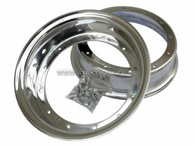 Aluminium Dax velg. Diameter: 10". Breedte: 3.00. Deze velg is geschikt voor een originele Dax of replica Dax. Hij is breder dan de standaard velg. Dit betreft een complete velg dus twee helften.